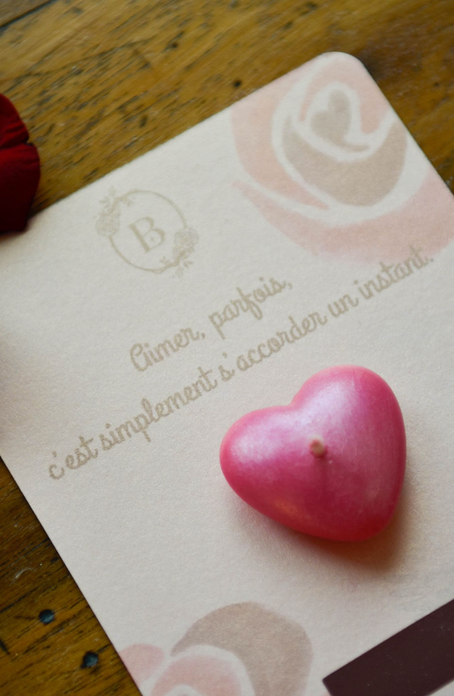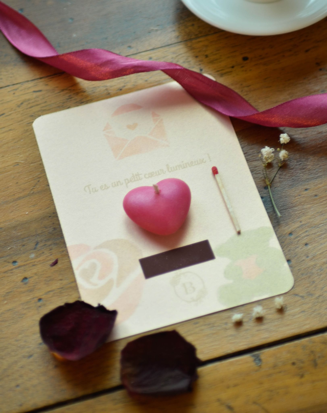 • Inclus :Cette carte accompagnée d’un cœur parfumé — rose vanillée sans CMR ni phtalates, fabriqué à Grasse allumette et son support pour l'allumer